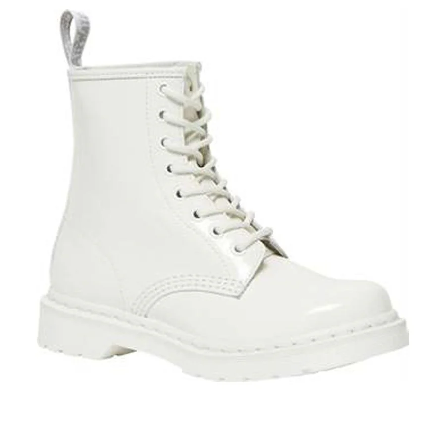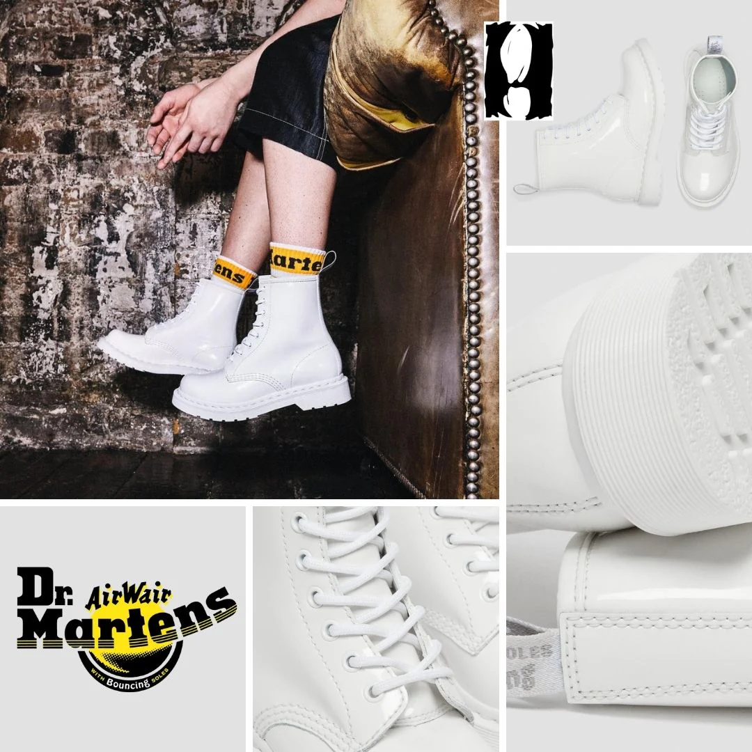 La botte Dr.Martens 1460 porte son nom en raison de sa naissance. Elle est née le 01.04.60. En six décennies, notre botte de travail à 8 œillets est devenue emblématique. Portez la Dr.Martens blanche vernie Patent Lamper, un cuir à grain fin, enduit pour donner une finition brillante.