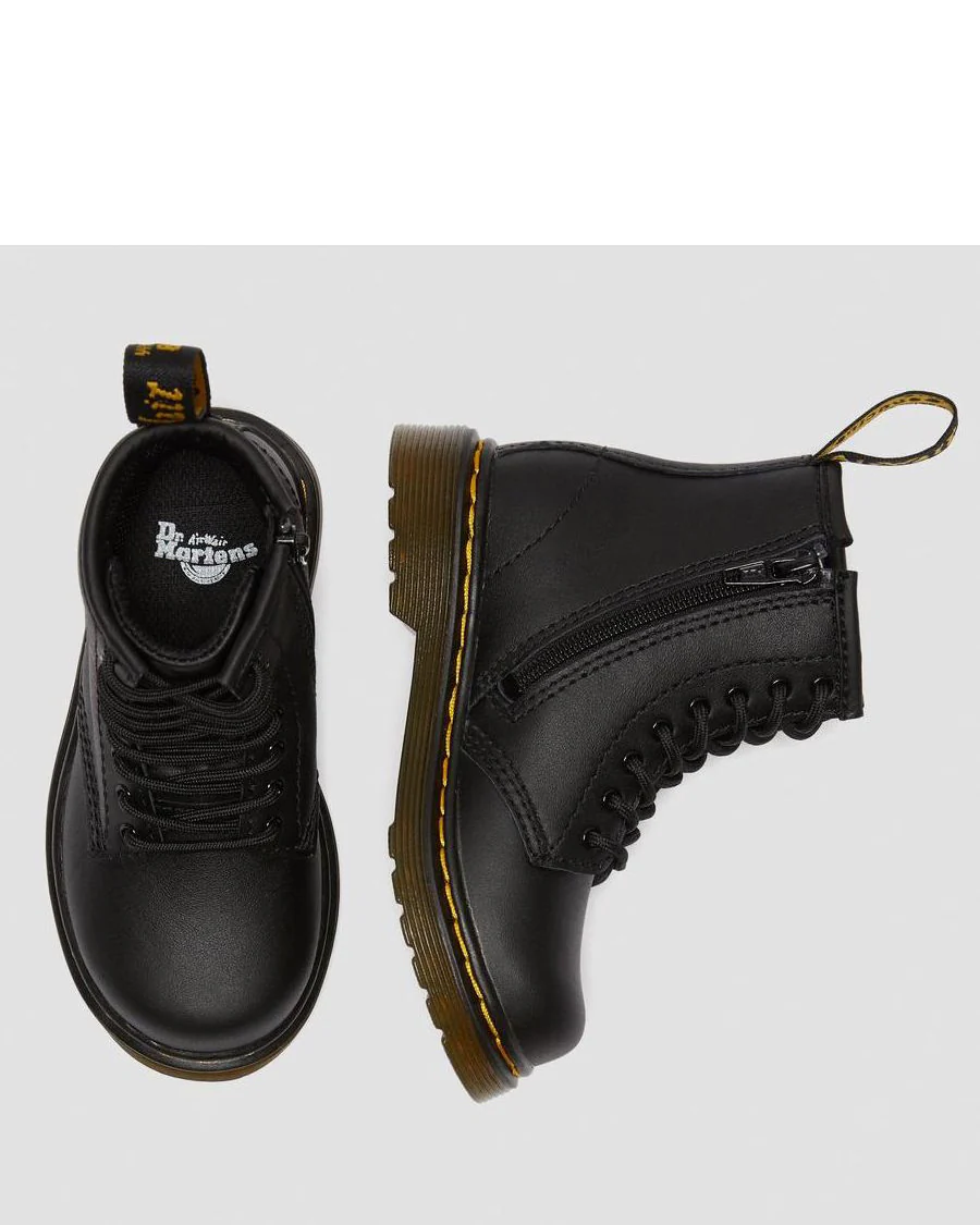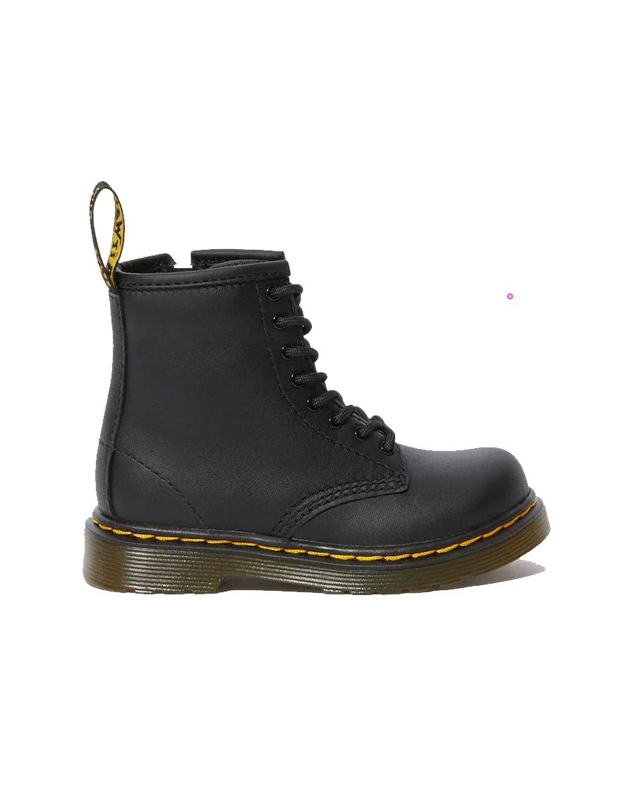 Voici la botte noire Dr. Martens TODDLER 1460 SOFTY. C’est une version réduite de la botte classique à 8 œillets où le style rebelle rencontre de petites proportions. Cette version mini est fabriquée en cuir Romario souple. Elle comprend les coutures jaunes emblématiques et la boucle de talon AirWair. Une fermeture à glissière située sur le côté intérieur permet d’enfiler et de retirer facilement la botte. Cette botte pour enfant est montée sur une édition plus flexible de la semelle à coussin d’air classique. Elle est conçue pour offrir confort et durabilité aux pieds en croissance.