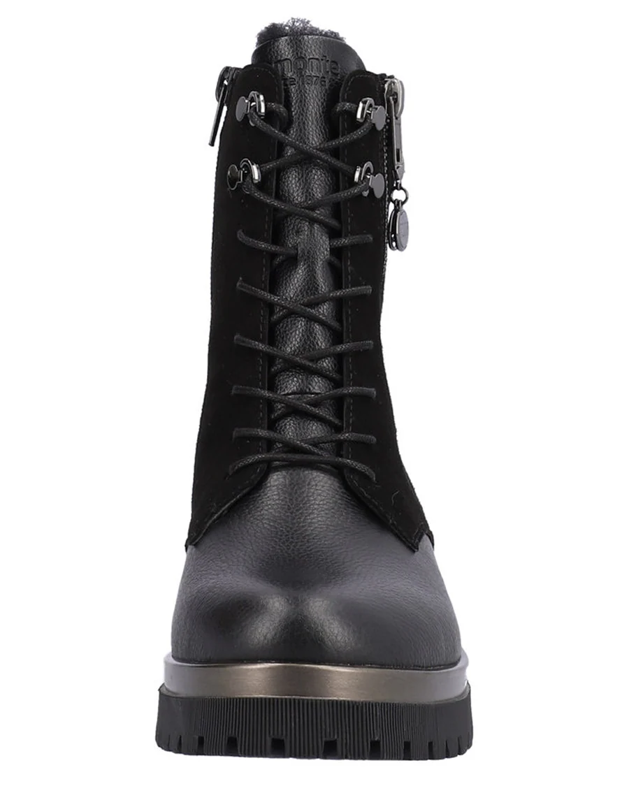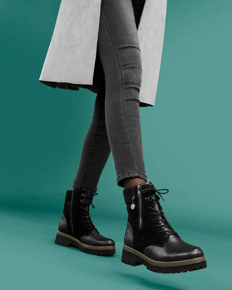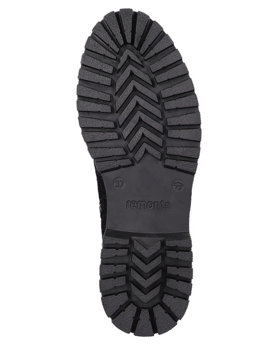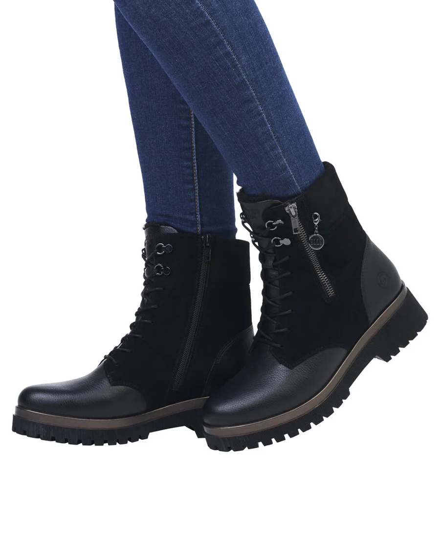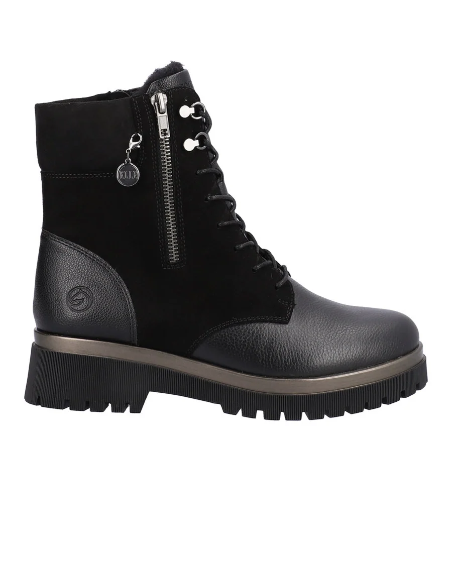 Cette botte d’hiver noire est dotée d’une tige composée de cuir et de matière synthétique. Les lacets permettent un ajustement personnalisé. Une fermeture éclair, du côté intérieur, permet d’enfiler et de retirer rapidement la botte. La fermeture à glissière du côté extérieur est décorative. Une breloque amovible argentée agrémente aussi le côté du bottillon. Doublées de laine, ces bottes garderont vos pieds au chaud. La semelle intérieure Remonte Thermo Insole est également constituée de laine, pour encore plus de chaleur. Cette semelle possède également une couche de mousse qui absorbe les chocs et un film thermique qui protège du froid. La semelle extérieure procure une bonne traction. Une bande de couleur bronze agrémente le haut de la semelle. Le talon a une hauteur d’environ 3.5 centimètres.