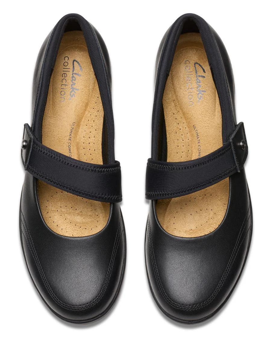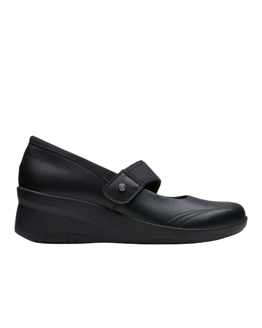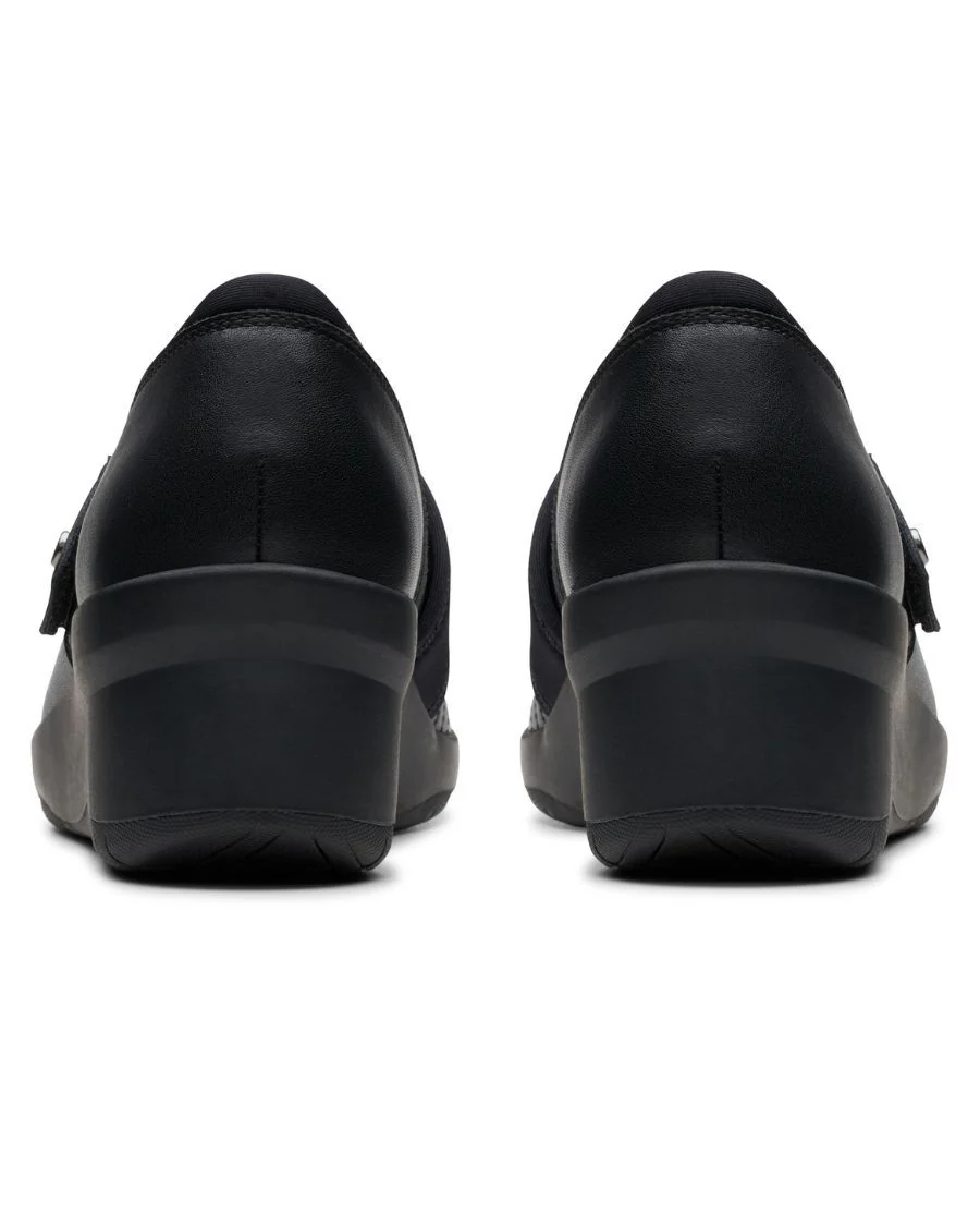 Mots-clés : chaussure noire à talon compensé, chaussures CLARKS femme, talon compensé confortable, chaussure à enfiler femme, soulier élégant à talon, chaussures en cuir noir, talon compensé léger, soulier femme flexible, chaussure confort CLARKS