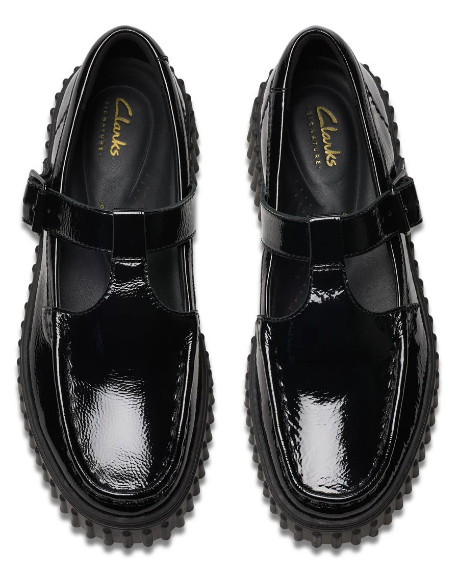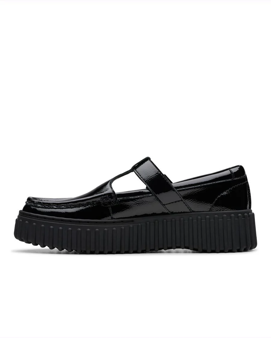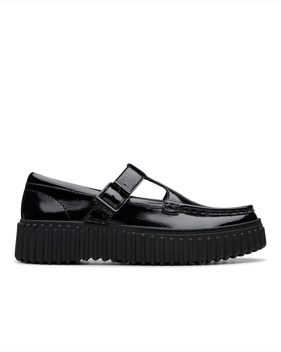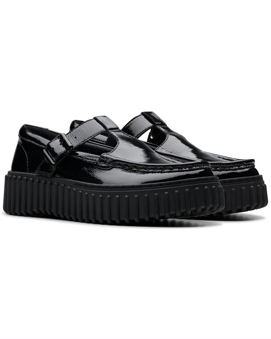 Mots-clés : chaussure urbaine femme, Clarks, modèle TORHILL BAR, chaussure noire vernie, confort durable, sangle en T, fermeture boucle ajustable, assise plantaire coussinée, semelle TR, style rétro, confort moderne, chaussure élégante femme.