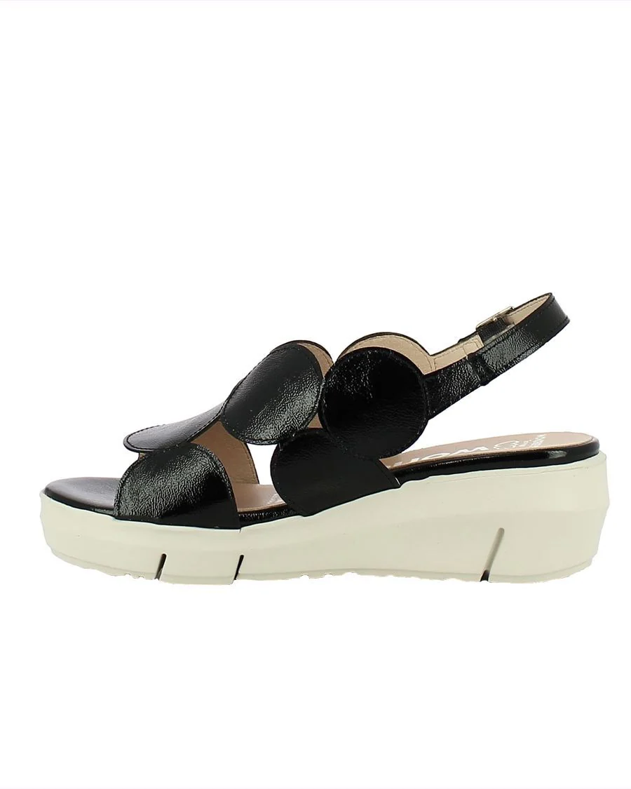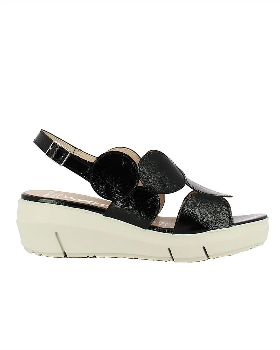 Cette sandale noire est dotée d’une tige en cuir. Elle présente un design original de formes circulaires, un bout rond et une semelle compensée. La bride de cheville est munie d’une fermeture à boucle réglable. La semelle intérieure MemoryGEL est confortable. La semelle a été développée grâce à la technologie innovante WondersFly™, garantissant légèreté et confort. Le talon a une hauteur d’environ 5.5 centimètres.